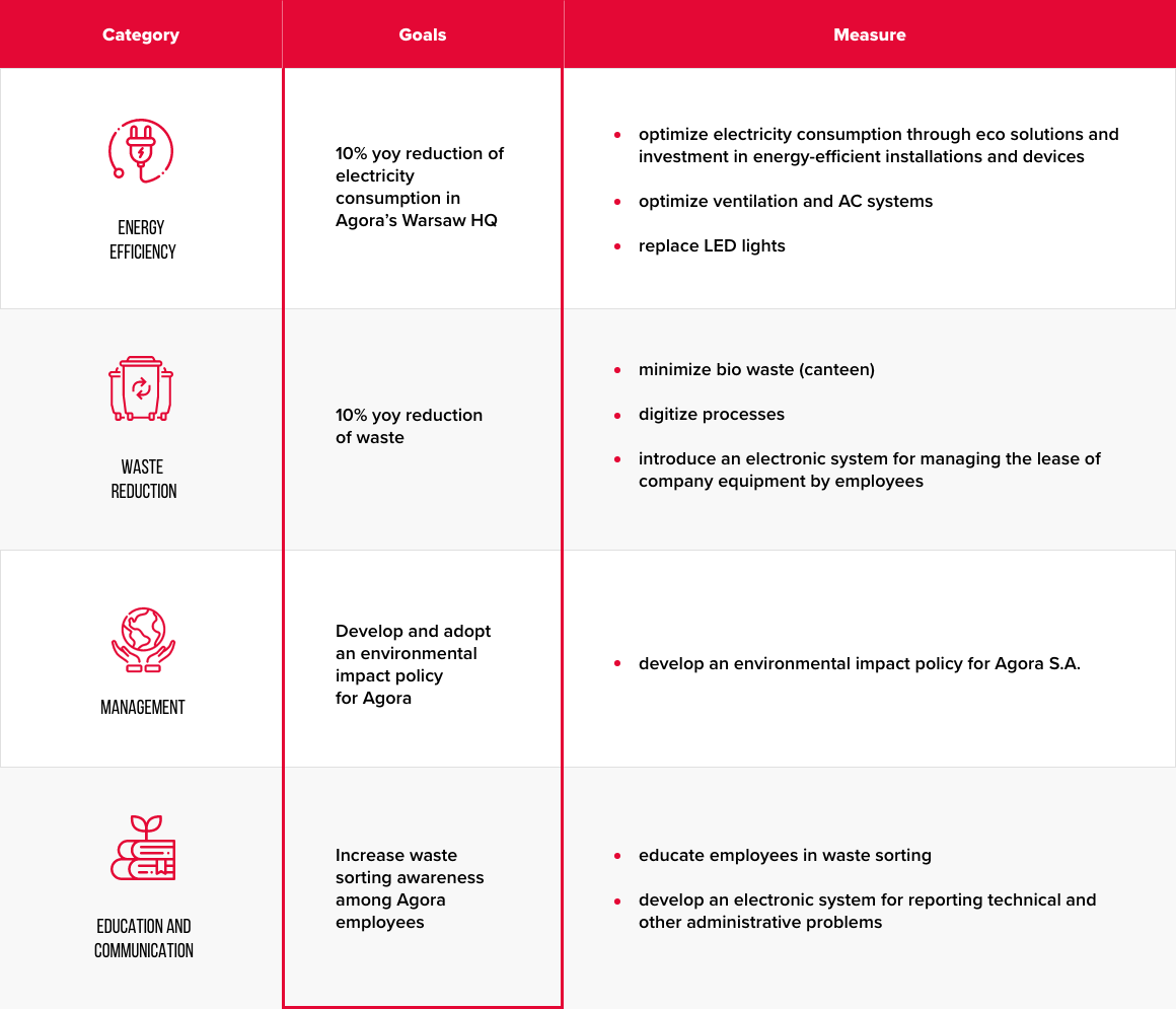 The main elements of the environmental impact management in Agora Group in building administration are: reduction of electricity and water consumption and the output of effluents. This is particularly important for Czerska 8/10 office that houses most of the entities of Agora Group.